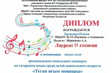 Диплом нагрждается Заспенко Олеся педпгог Шарипова Алина Алексеевна Лауреат II степени в номинации "Туган ягым моңнары" 27.04.2024