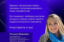 Преподаватель общеобразовательных дисциплин Лениногорского нефтяного техникума, амбассадор всероссийского Форума классных руководителей Татьяна Мадиева будет бороться за участие в ТВ-шоу «Классная тема». Проект был запущен в прошлом году по поручению Президента РФ Владимира Путина. ✅ Принять участие в телешоу «Классная Тема!» могут учителя физики, химии, математики, биологии, географии, истории, русского языка и литературы. Подать заявку на участие можно тут (https://clck.ru/sP5xS. Регистрация продлится до 20 июня. #МБДОУ12РосинкагородАзнакаево 17.05.2023