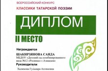 Воспитанница старшей группы Шакирзянова Саида приняла участие во всероссийском конкурсе Классики Татарской поэзии и была награждена дипломом II степени 09.06.2025