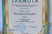 Грамота награждается Рахина Гузель 1 место муниципальная олимпиада "Грамотейка" среди детей старшего дошкольного возраста.педагог Шакирзянова Р.М. 27.05.2021