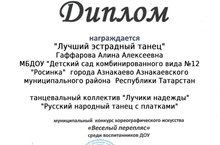 Диплом "Лучший эстрадный танец" Танцевальный коллектив "Лучики надежды" Русский народный танец с платками. Муниципальный конкурс хореографического искусства "Веселый перепляс" среди воспитанников ДОУ 03.06.2021