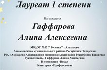 Диплом Лауреат 1 степени награждается музыкальный руководитель Гаффарова Алина Алеексеевна в номинации - Вокал Категория - Профессионал 29.04.2021