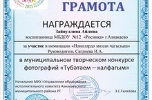 Награждается дипломом Зайнуллина Айлина за участие в номинации "Нәниләрдә милли чагылыш" Руководитель Сагдиева И.А. в муниципальном творческом конкурсе фотографий "Түбәтәем - калфагым" 17.05.2021