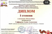 Диплом 1 степени в номинации "Песни войны" Гаффарова Алина Алексеевна 25.05.2021