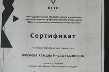 Получение сертификата воспитателя Фасиевой Х.И. прошла обучение в рамках реализации образовательного модуля "Формирование навыков оказания первой помощи" г.Казань ЦСГО 23.10.2019