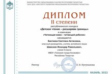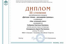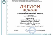 Республикакуләм "Балалар укуы: чикләрне киңәйтү" бәйгесендә жиңу яулаган 6А сыйныф укучысы Саетшина Алияне, 7Б сыйныф укучысы Әхмәдишина Әдиләне(укытучылары Сабирова С. Н.) , 9А сыйныф укучысы Ибраһимова Ләйләне (укытучысы Әхмәтова Л. Х.) котлыйбыз. Әлеге бәйге профессиональ осталыкны арттырырга, иҗади потенциалны тормышка ашырырга ярдәм итә. -