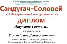 Ученик 7Б класса, наш талантливый Багаутдинов Денис, стал истинным воплощением своего имени, прозвучав как звонкий Сандугач-Соловей на международной арене! Мы с огромной гордостью объявляем: Денис удостоен звания Лауреата 1 степени 13-го Международного конкурса вокалистов «Сандугач-Соловей» в номинации: Народное пение (вокал-соло)»!Поздравляем Дениса и учителя музыки Зульфию Шамиловну с этим блистательным достижением! Желаем неиссякаемого вдохновения, новых творческих высот и пусть Сандугач-Соловей всегда поёт, принося радость и гордость!