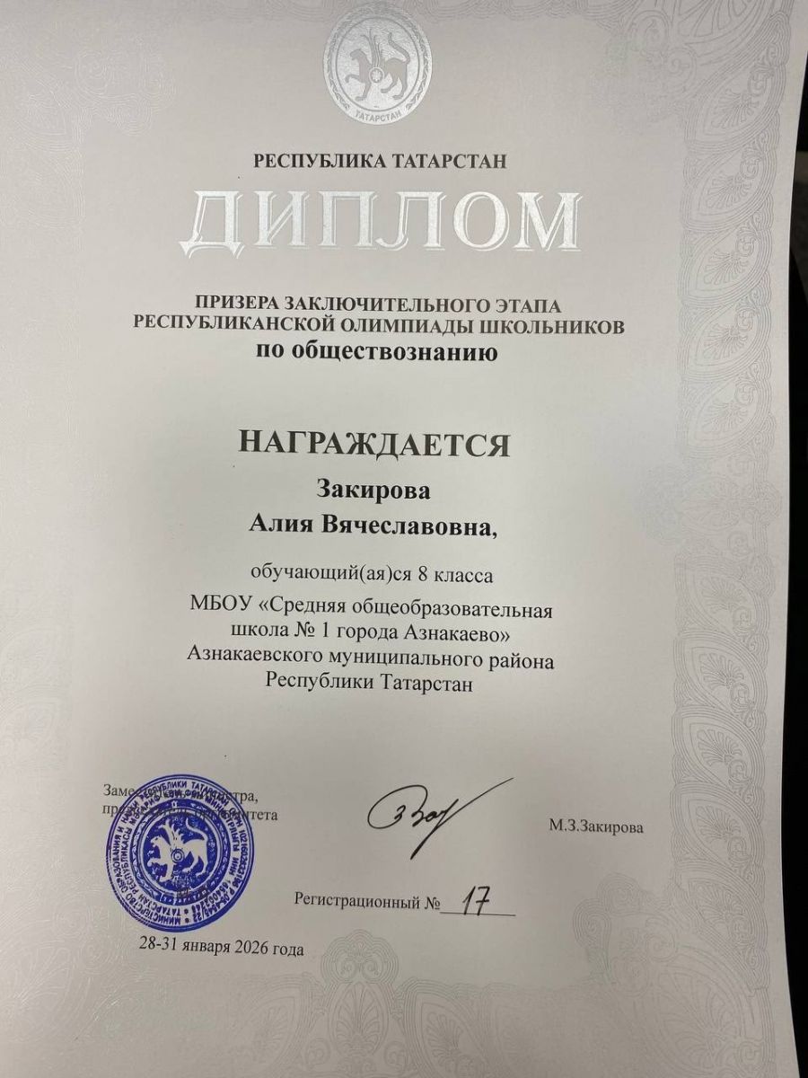 Региональный этап Всероссийской олимпиады и заключительный этап Республиканской олимпиады по обществознанию завершился успехом наших учеников! Поздравляем учениц нашей школы, ставших призёрами олимпиады школьников по обществознанию!Ахметзянова Карина стала призёром регионального этапа Всероссийской олимпиады школьников среди учащихся 10-х классов, а Закирова Алия показала блестящие знания и заняла призовое место в заключительном этапе Республиканской олимпиады среди учеников 8 класса.Это достижение стало возможным благодаря усердию, целеустремлённости и глубокой заинтересованности обеих участниц предметом обществознание. Мы гордимся вашими успехами, девочки, и благодарим вас за стремление к новым вершинам и упорство в достижении поставленных целей!