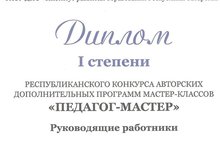 На основании приказа Министерства образования и науки РТ от 20.04.2015 г №4955/15 в период с 27 апреля 2015 года по 01 июля 2015 года был проведен конкурс авторских дополнительных прогроамм мастер - классов "Педагог - мастер", где приняла участие учитель истории и обществознания Якупова Гюзель Альбертовна. Она награждена дипломом I степени.Поздравляем ее!