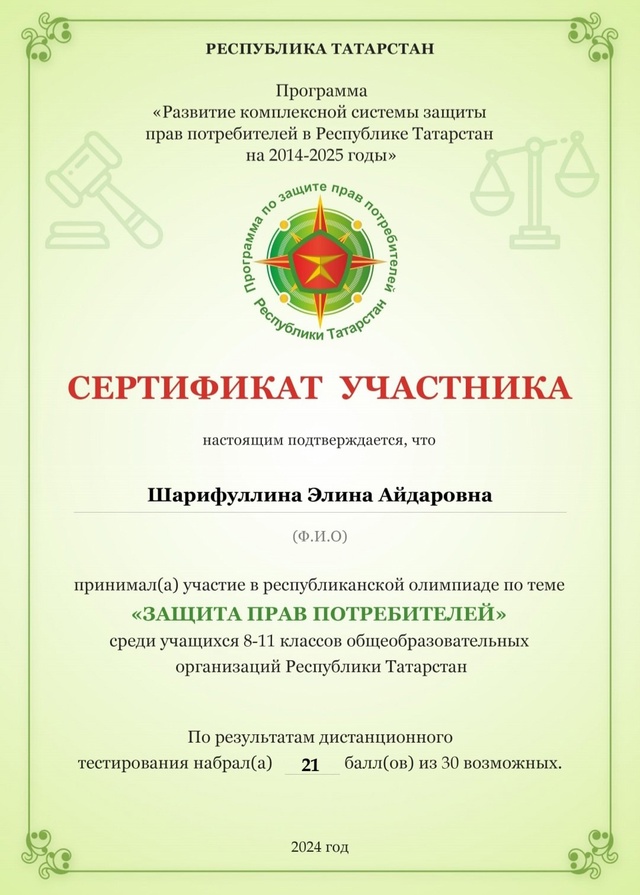 Учитель обществознания Якупова Г.А.Безнең укучылар Кулланучылар хокукларын яклау буенча Бөтенроссия олимпиадасының икенче этабында уңышлы чыгыш ясадылар, законнар һәм практиканы тирәнтен белүләрен күрсәттеләр. Хәйруллин Данияр һәм Шәрифуллина Элина уңышларын раслый торган сертификатлар алдылар. Бу казанышлар аларның портфолиосына кыйммәтле өстәмә булачак һәм киләчәктә белем алуда ярдәм итәчәк. Җәмгыять белеме укытучысы Якупова Г. А.
