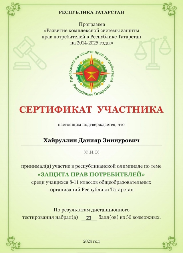 Наши ученики успешно выступили на втором этапе Всероссийской олимпиады по защите прав потребителей, показав глубокие знания законодательства и практики. Хайруллин Данияр и Шарифуллина Элина получили сертификаты, подтверждающие их успехи. Эти достижения станут ценным дополнением к их портфолио и помогут в дальнейшем образовании.