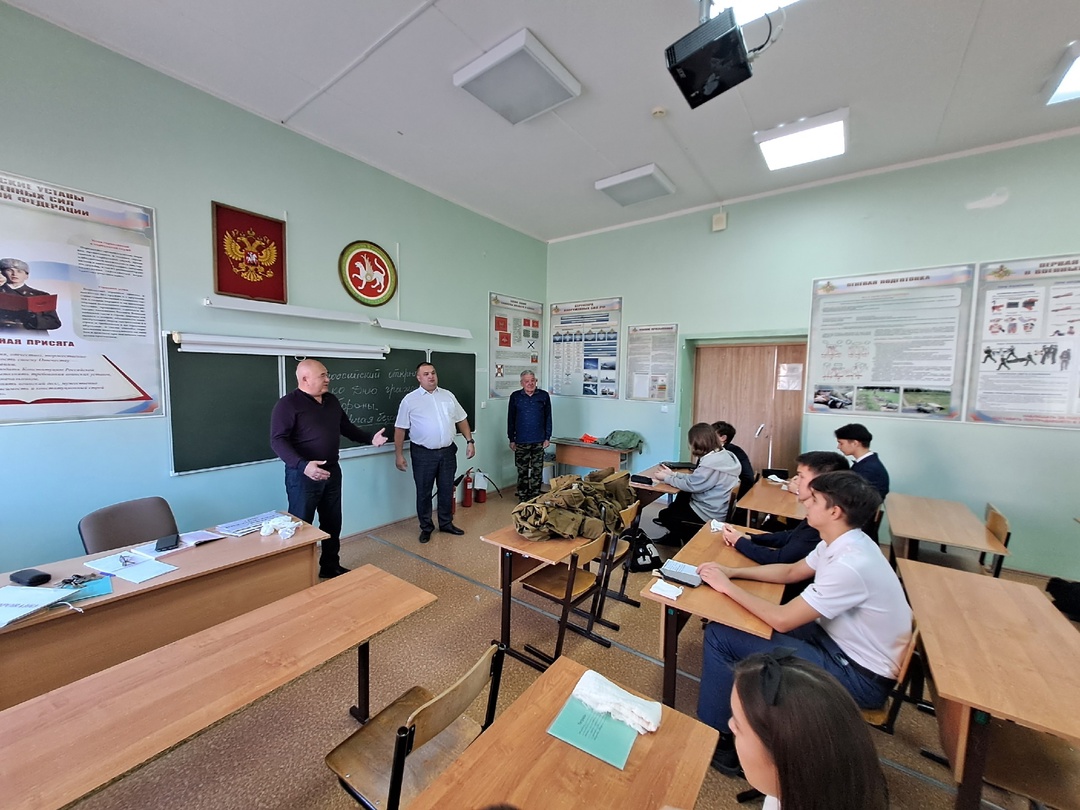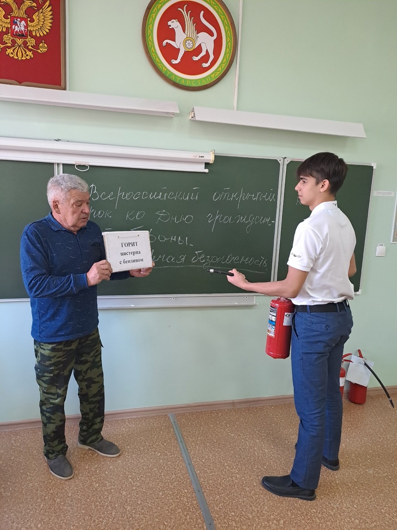 Ватанны саклау һәм иминлек нигезләре укытучысы Усманов А.Ш. Гражданнар оборонасы көненә багышланган Бөтенроссия ачык дәресен Азнакай муниципаль районы башкарма комитеты урынбасары Ханнанов Р. Р катнашында, 9Б сыйныфында "Индивидуаль саклану чаралары" темасына дәрес үткәрде.