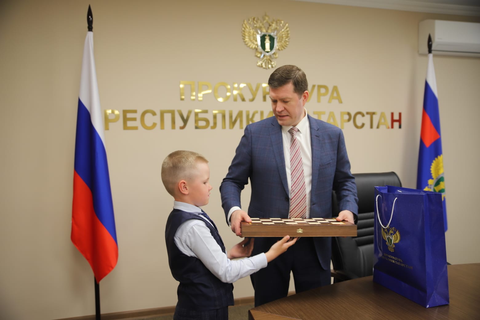 31 мая ученик 1А класса средней школы №1 г.Азнакаево Яфизов Ранель был приглашён на встречу с прокурором Республики Татарстан Суяргуловым А.З.Ещё зимой Ранель подготовил доклад с видеосюжетом об Азнакаевской городской прокуратуре для НПК "Открытие". Этот видеосюжет также был опубликован в социальных сетях республиканской прокуратуры.Ранее он изъявил о своем желании увидеться с прокурором республики. В преддверии Дня защиты детей его желание исполнилось. После напутственных слов прокурора ему был вручен подарок - шахматы. Подарок пришёлся кстати, так как Ранель планирует на каникулах научиться в них играть и уже начал изучать историю этой игры. Желаем юному исследователю дальнейших побед как в науке, так и в спорте.