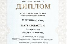 2 место на Республиканской олимпиаде! С 16 по 18 февраля в г. Казань прошел заключительный этап Республиканской олимпиады по татарскому языку среди учащихся татарских групп школ с русским языком обучения. Наша ученица 11 класса Латифуллина Файруза заняла 2 место среди 38 участников. Молодец! (Руководитель: учитель татарского языка и литературы Тинбакова Р.В.) Поздравляем Файрузу и Римму Варисовну с Вашими достижениями! Желаем Вам дальнейших творческих успехов!