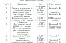 Сегодня в школе началась неделя химии. Будут проведены открытые уроки, встреча с представителями химико-технологического университета и многое другое по плану. План можно посмотреть по ссылке.