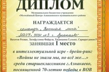 На этой неделе прошел завершающий тур интеллектуальной игры - брейн-ринг "Войны не знали мы, но всё же..." среди старшеклассников г.Азнакаево, посвященной 70-летию победы в ВОВ. Команда нашей школы в составе Вахитова Ризвана, Латифуллиной Файрузы, Хасаншиной Гульназ, Сарваретдинова Руслана под руководством Юмаковой Екатерины александровны заняла первое место. Молодцы, ребята!