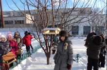 В первый день после каникул учащиеся 1а класса под руководством Билаловой Разили Гизетдиновны соорудили кормушки для птиц и развесили их на пришкольном участке. Учащиеся рассказывали о трудностях, которые претерпивают птицы в зимний период. Дети рассказывали стихи, вспомнили загадки, пословицы про птиц.
