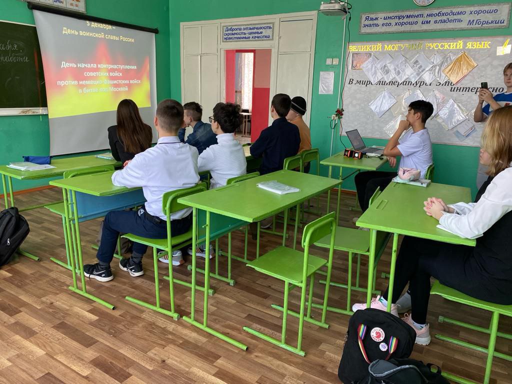 5 декабря - день воинской славы России, день начала контрнаступления советских войск против немецко-фашистских войск в битве под Москвой. В 5-10 классах был проведены классные часы, посвященные подвигу 12 дивизий народного ополчения, подвигу добровольцев защищавших Москву