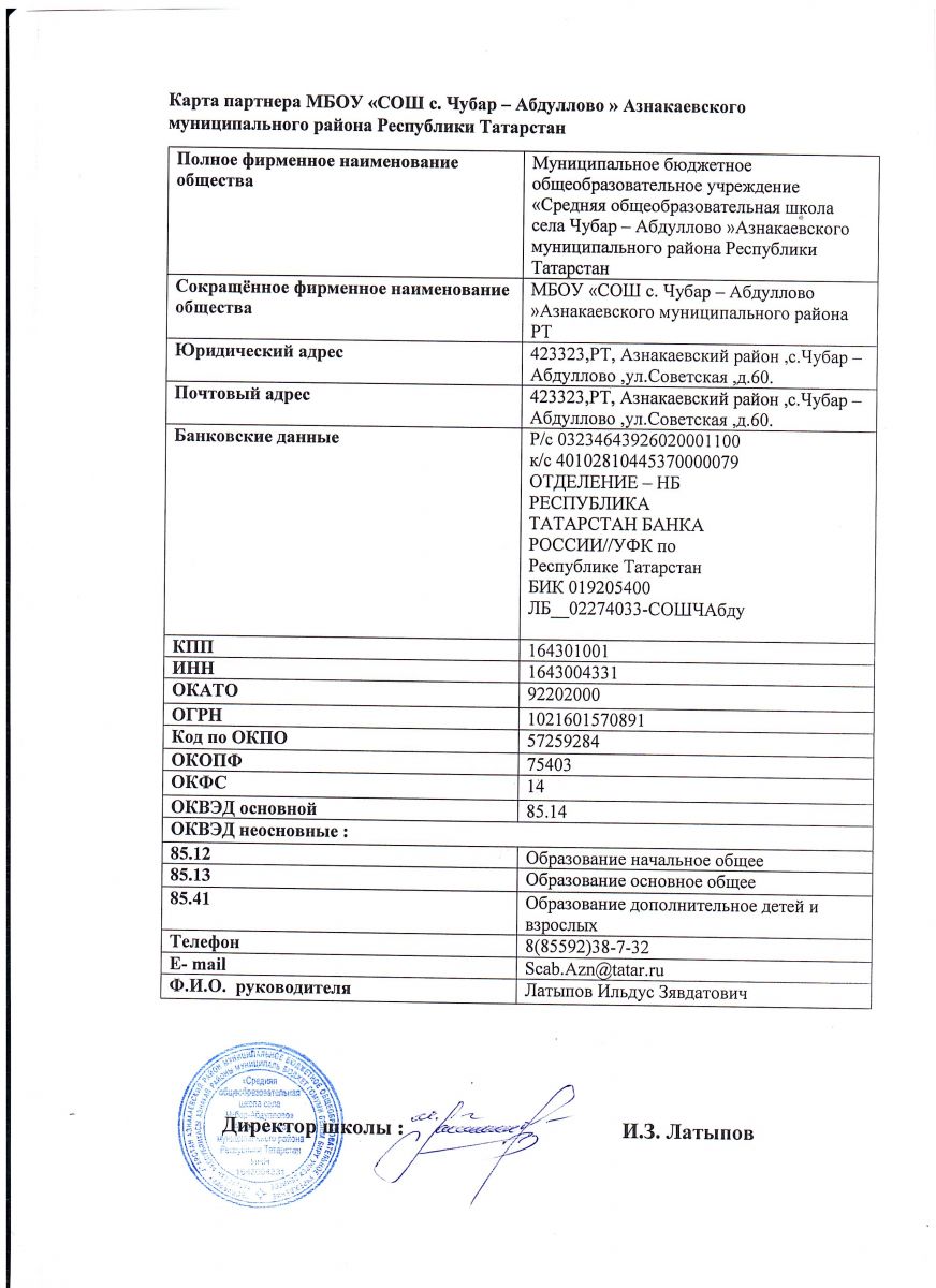 Карта партнера МБОУ "СОШ с. Чубар - Абдуллово" Азнакаевского муниципального района РТ