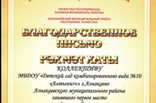 Коллектив МБДОУ "Детский сад комбинированного вида №10 "Алтынчеч" занял I место в конкурсе поделок из бросового материала и получил Благодарственное письмо от Главы Азнакаевского муниципального района Шайдуллина Марселя Зуфаровича.