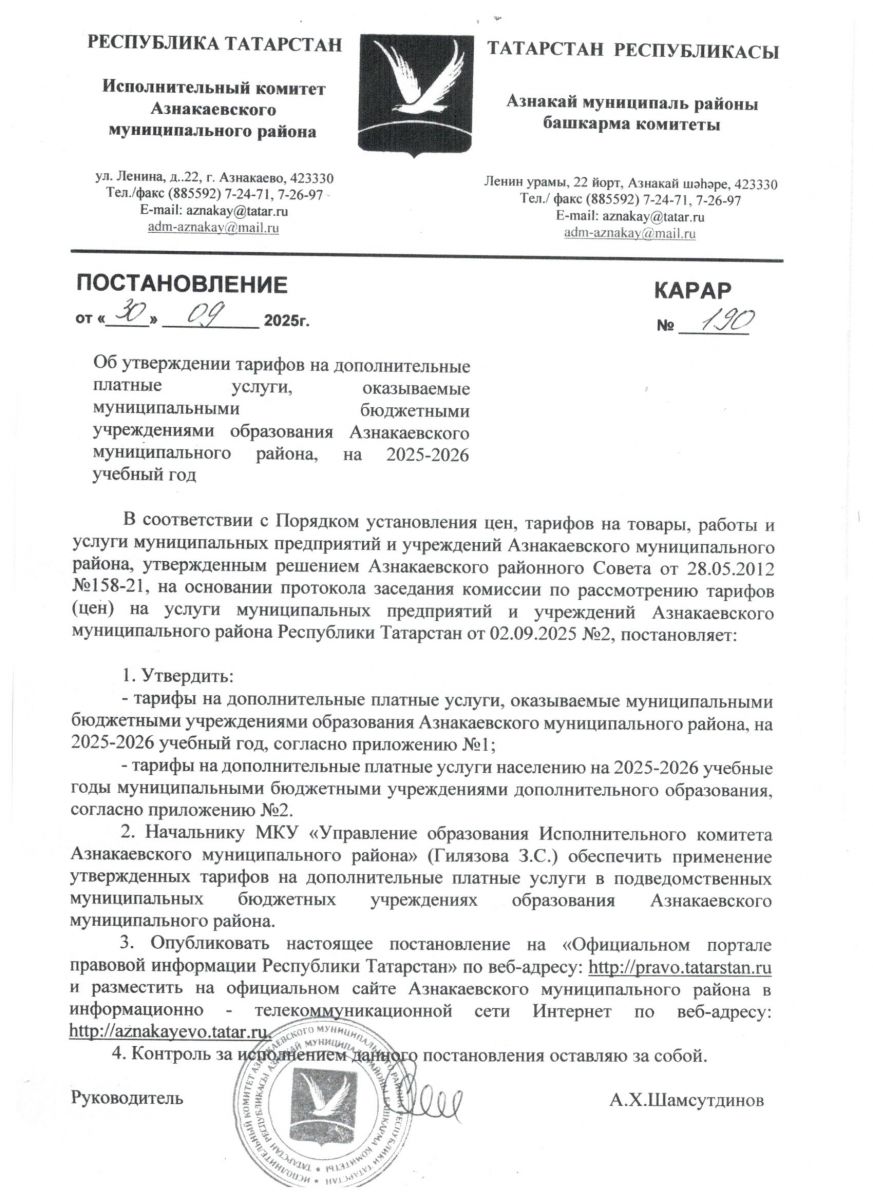 - Постановление о тарифах платных услуг на 2025-2026 гг