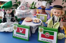 Одной из главных задач, стоящих перед современным обществом - духовное, нравственное возрождение, которое невозможно осуществить, не усваивая культурно-исторический опыт народа, создаваемый веками громадным количеством поколений и закрепленный в произведениях народного творчества. Сохранение культуры каждого народа и ее развитие, с этой целью мы организовали тематическую неделю "Национальной культуры" посвященную Году Родных Языков. Была проведена беседа с детьми «Наша Родина -Татарстан» . Познакомили детей государственнойсимволикой; образцами национальных костюмов (куклы в национальных одеждах); предметы обихода с татарской национальной символикой;