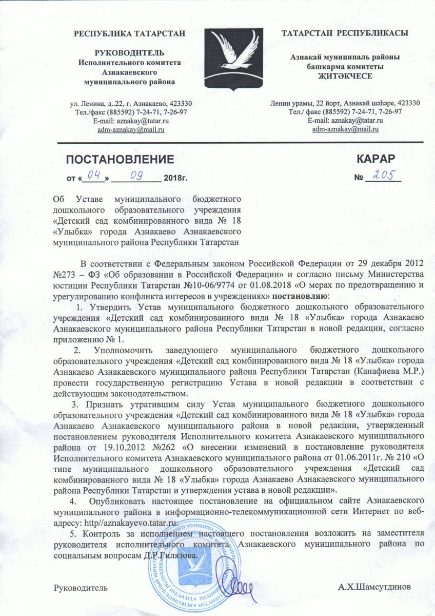 Муниципальное бюджетное дошкольное образовательное учреждение «Детский сад комбинированного вида №18 «Улыбка» г. Азнакаево Азнакаевского муниципального района РТ