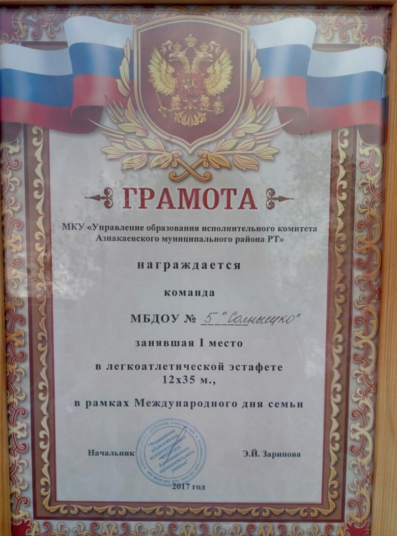 Первое место в легкоатлетической эстафете, в рамках Международного дня семьи. 19.05.2017