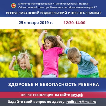 Во исполнение плана работы Министерства образования и науки Республики Татарстан 25.01.2019 с 12.30 до 14.00 состоится Республиканский родительский интернет-семинар «Здоровье и безопасность ребенка».