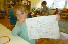 Дети подготовительной к школе группы вышивают платок для мам.