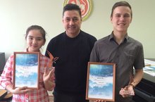 "Если бы..." дип исемләнгән сәхнә осталыгының Бөтенроссия V нче Ачык фестиваль- конкурсы лауреатлары Азат Миргалиев һәм Мәдинә Мансурова җитәкчеләре Илдар Ансарович Динмухаметов белән.