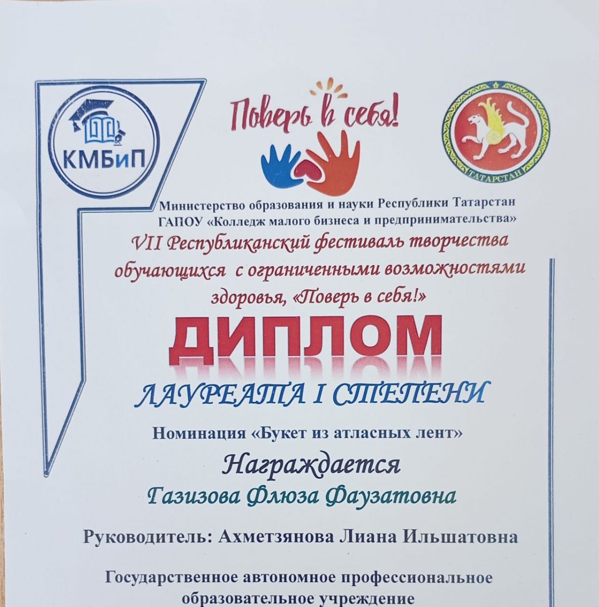 Наша обучающаяся Газизова Флюза, под руководством педагога-организатора Ахметзяновой Л. И., в номинации "Букет из атласных лент" получила диплом Лауреата I степени.