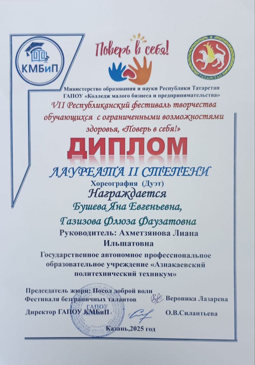 Хореографический дуэт техникума Бушевой Яны и Газизовой Флюзы, под руководством педагога-организатора Ахметзяновой Л. И., стал Лауреатом II степени.