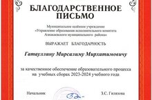 Гатауллин М.М. награжден Благодарственным письмом МКУ «Управление образования исполкома АМР» за качественное обеспечение образовательного процесса на учебно-полевых сборах 2023-24 уч.г. Сборы проходили с 26 по 29 мая на поляне близ села Альферовка, где Мирсалим Мирхатимович организовал и провел занятия по тактической подготовке. При подведении итогов взводы, показавшие лучшую тактическую подготовку Мирсалим Мирхатимович наградил дипломами АНО Центр патриотического воспитания детей и молодежи "Парус". 10.06.2024