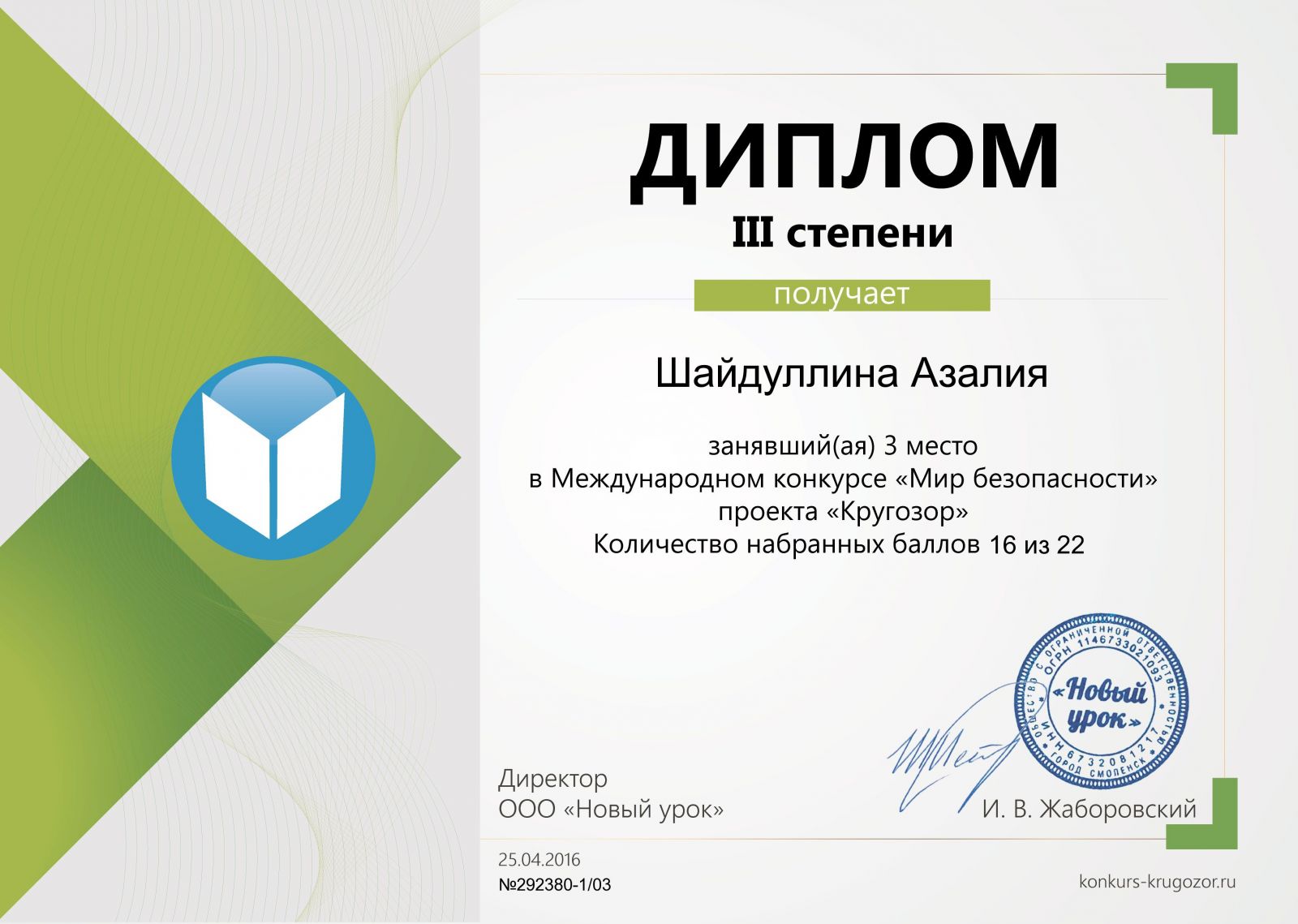 3 место в международном конкурсе «Мир безопасности проекта «Кругозор» (Шайдуллина А., Латыпова А.С.)