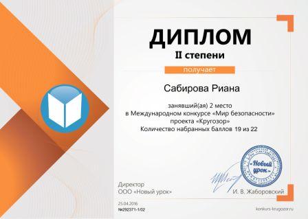 2 место в международном конкурсе «Мир безопасности проекта «Кругозор» (Сабиров Р., Латыпова А.С.)