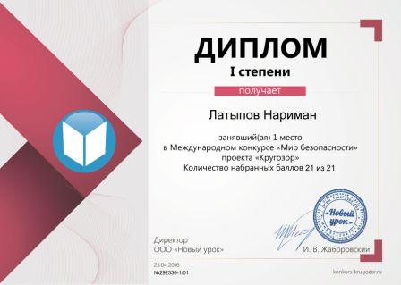 1 место в международном конкурсе «Мир безопасности проекта «Кругозор» (Латыпов Н., Латыпова А.С.)