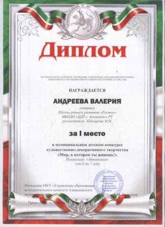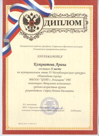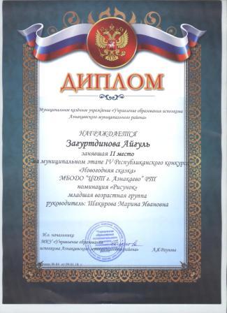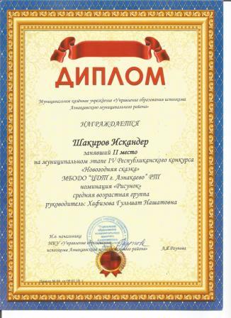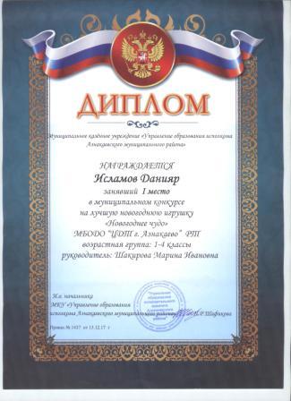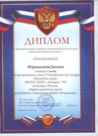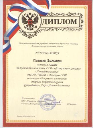 1 место на муницпальном этапе Республиканского конкурса "Новогодняя сказка" (Ганиева А., Стрих Р.Р.)