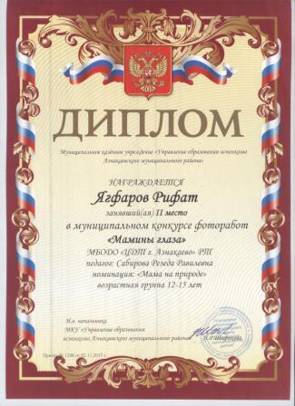 2 место в муниципальном конкурсе фоторабот «Мамины глаза» (Ягфаров Р., Сабирова Р.Р.)