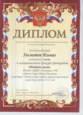 1 место в муниципальном конкурсе фоторабот «Мамины глаза» (Хисматов И., Стрих Р.Р.)