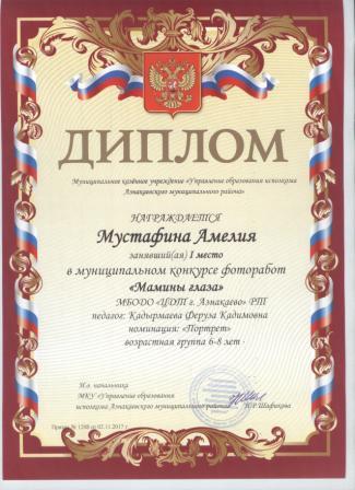 1 место в муниципальном конкурсе фоторабот «Мамины глаза» (Мустафина А., Кадырмаева Ф.К.)
