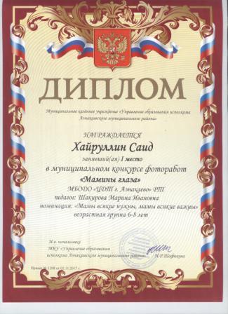 1 место в муниципальном конкурсе фоторабот «Мамины глаза» (Галеев М., Кашапова В.Х.)