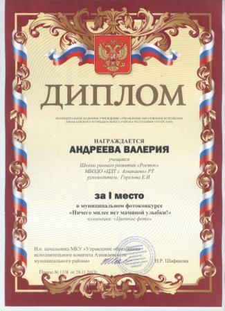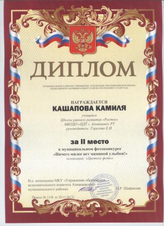 2 место в муниципальном фотоконкурсе «Ничего милее нет маминой улыбки!» (Кашапова К., Горелова Е.И.)