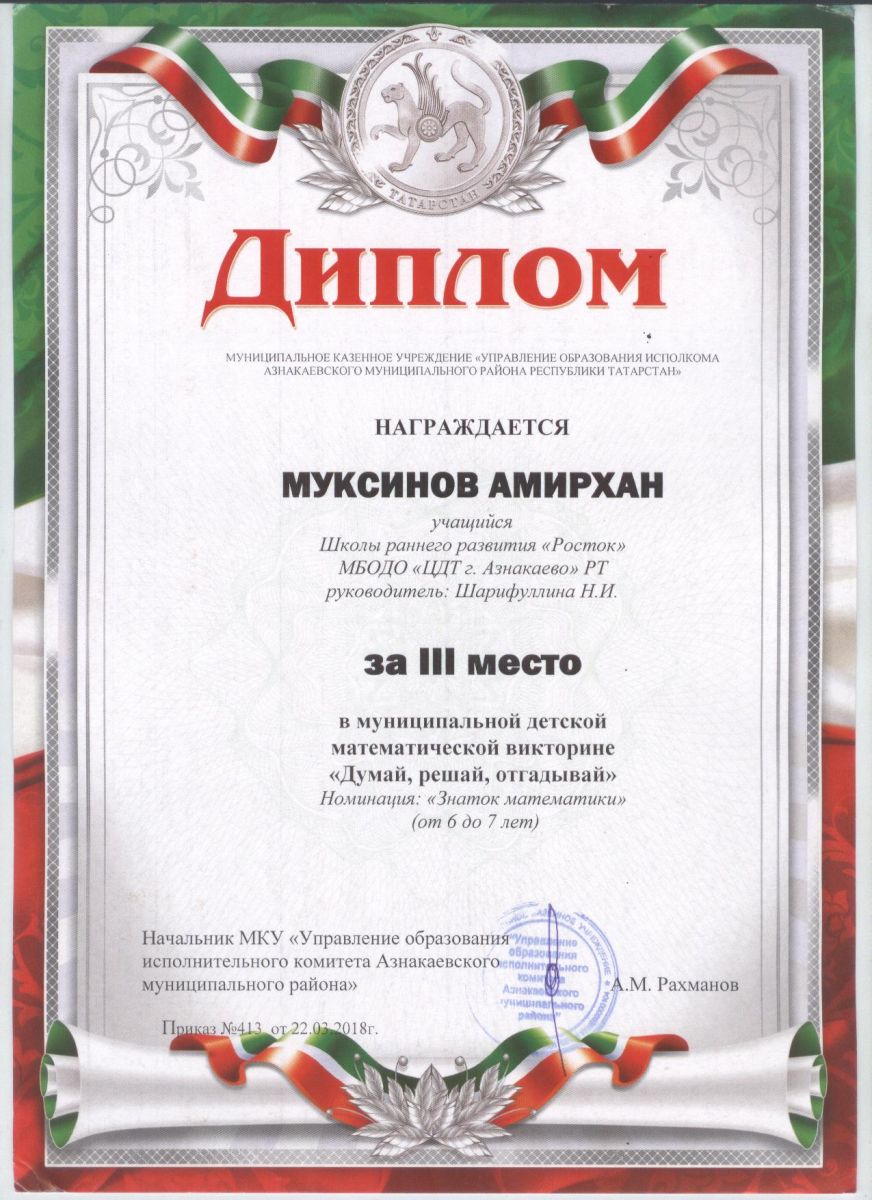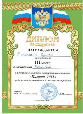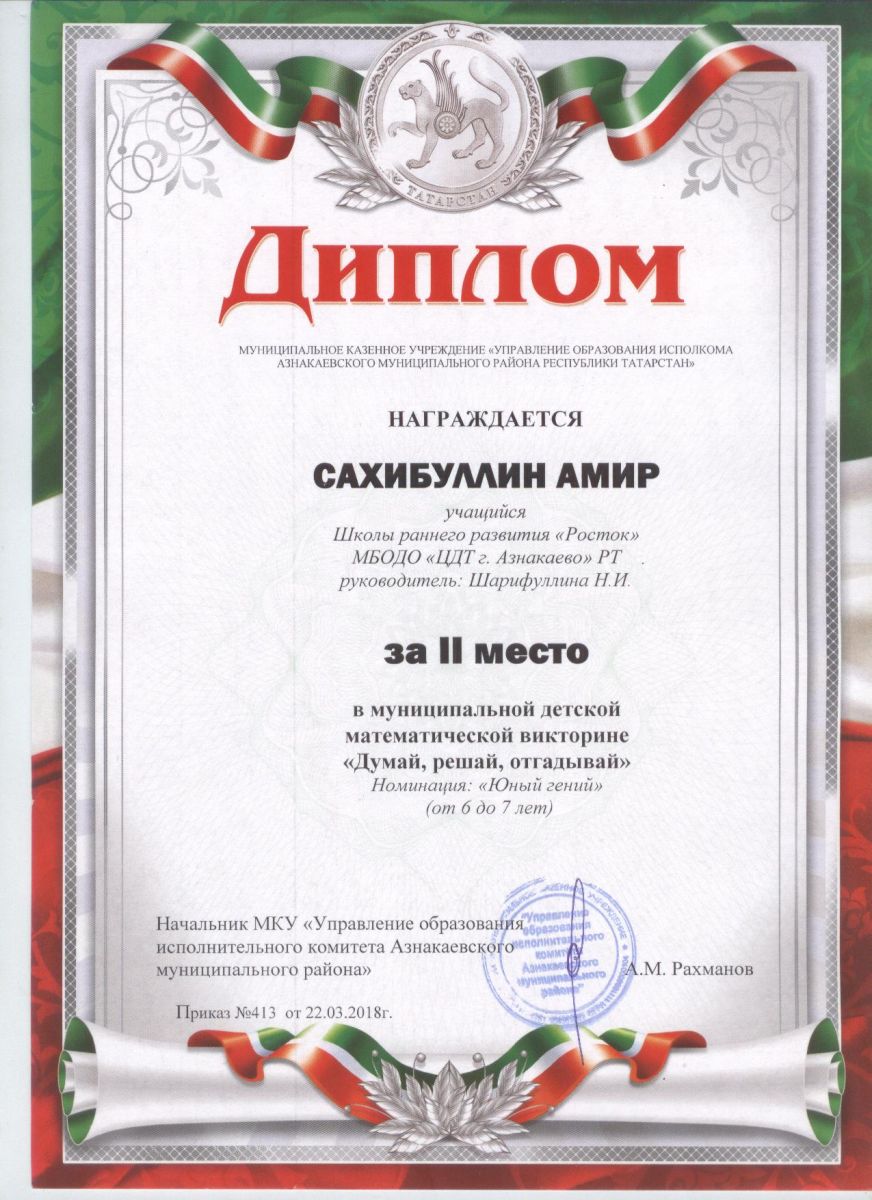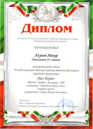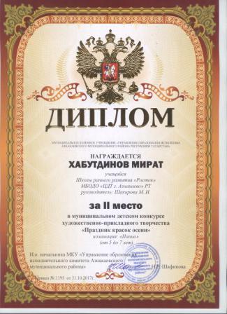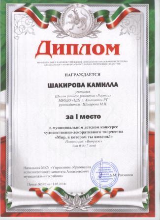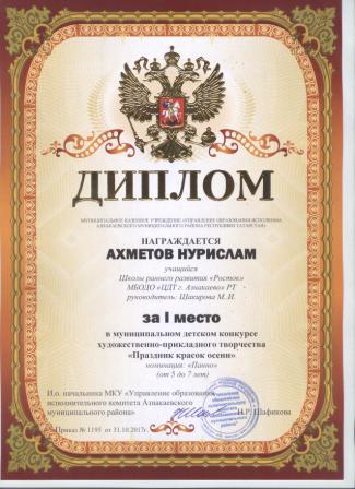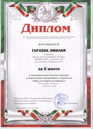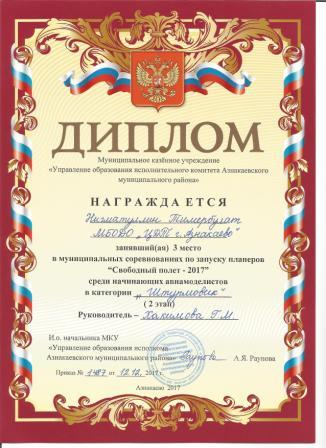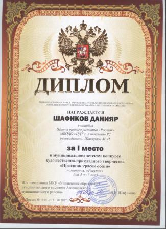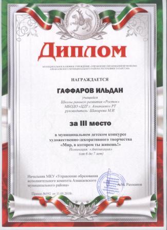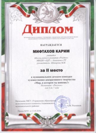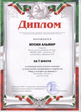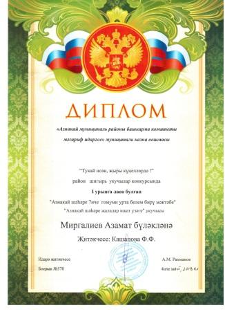 1 место в муниципальном конкурсе "Тукай исән, җыры күңелдә" (Миргалиев А.)