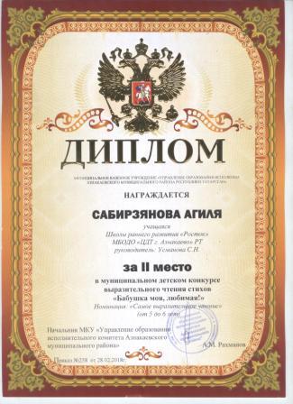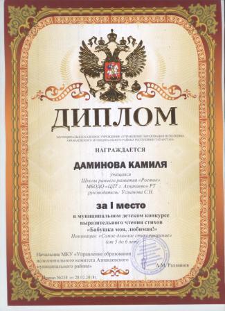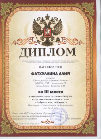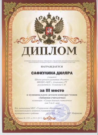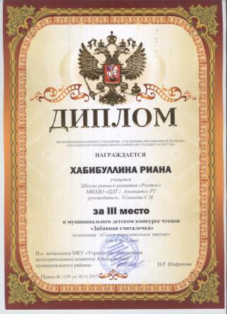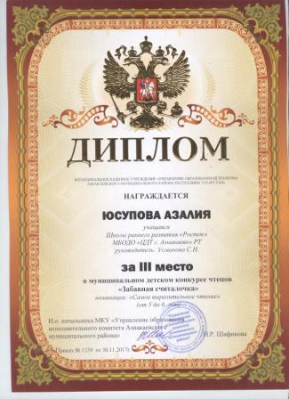 3 место в муниципальном детском конкурсе чтецов «Забавная считалочка» (Сафиуллина Д., Усманова С.Н.)