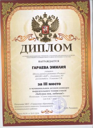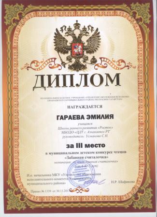 3 место в муниципальном детском конкурсе чтецов «Забавная считалочка» (Гараева Э., Усманова С.Н.)