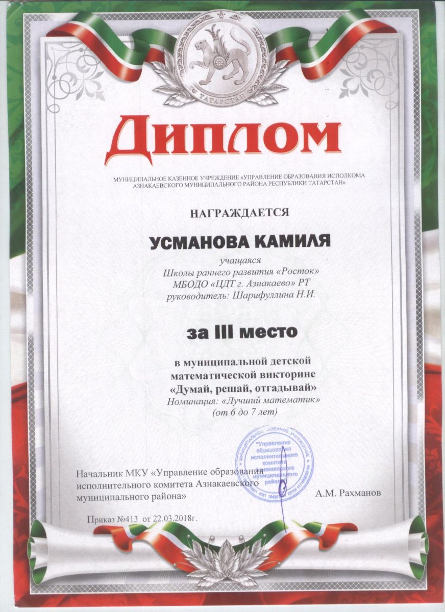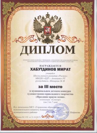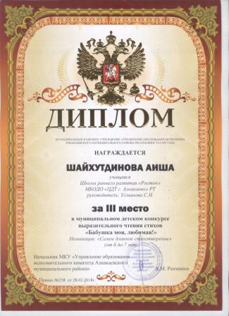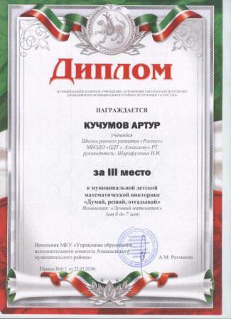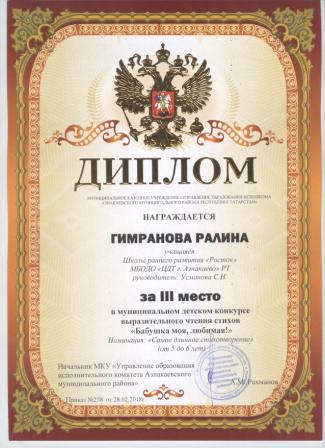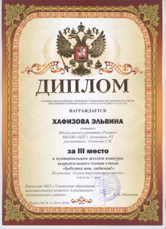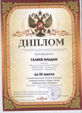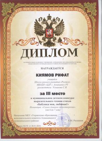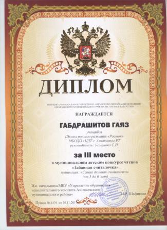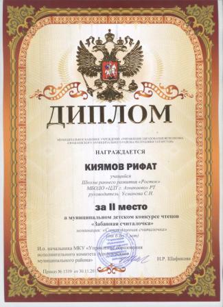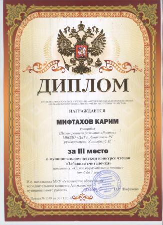3 место в муниципальном детском конкурсе чтецов «Забавная считалочка» (Мифтахов К., Усманова С.Н.)