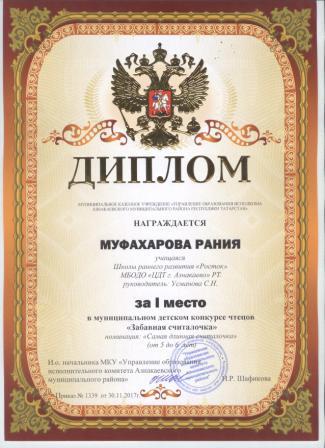 1 место в муниципальном детском конкурсе чтецов «Забавная считалочка» (Гайнуллина А., Усманова С.Н.)