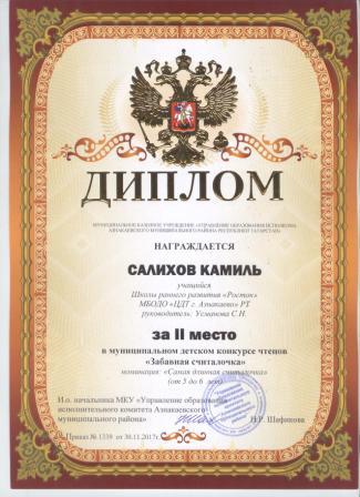 2 место в муниципальном детском конкурсе чтецов «Забавная считалочка» (Салихов К., Усманова С.Н.)