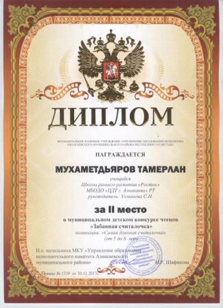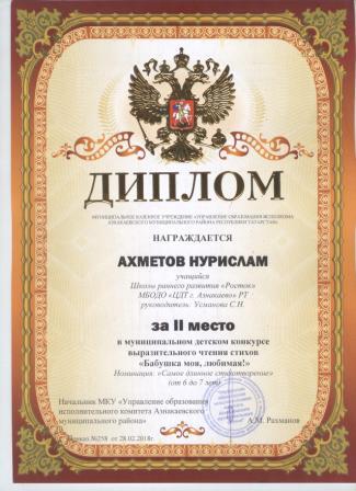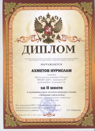 2 место в муниципальном детском конкурсе чтецов «Забавная считалочка» (Ахметов Н., Усманова С.Н.)